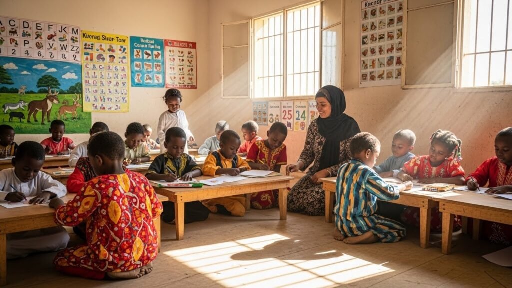 يتعلم الأطفال القراءة والكتابة بالإضافة إلى تعلم الأرقام، حيث يتمّ تدريسهم بطرق مميزة وجذابة عن طريق الغناء، والأناشيد، والألغاز، وغيرها من الوسائل التي تُشجع الطفل على التعلم.